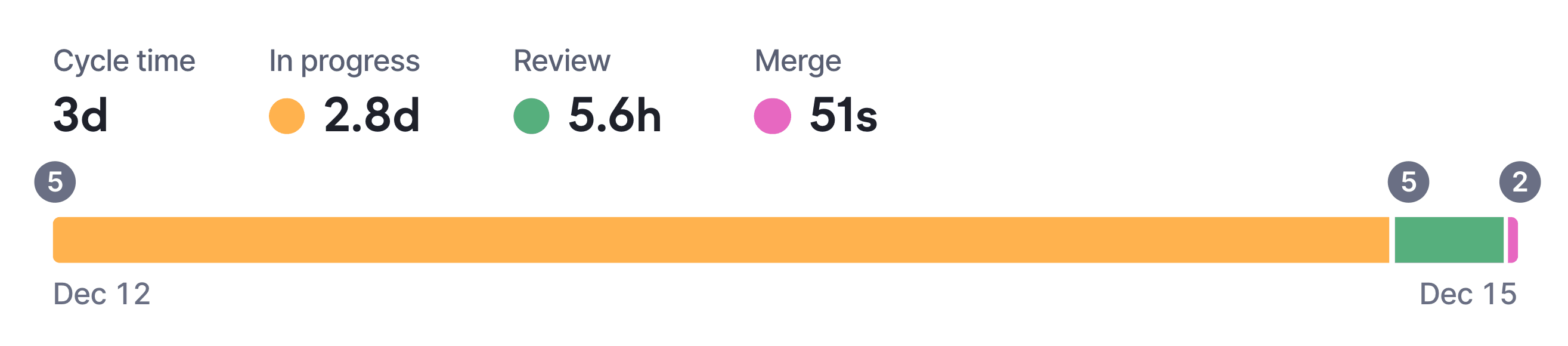 Cycle time is the total time a pull request spends in all stages of the development pipeline. It’s similar to change lead time above, but doesn’t include time to deploy. How different organizations define the stages can vary, but regardless, breaking it into stages can help reveal exactly where work gets stuck: