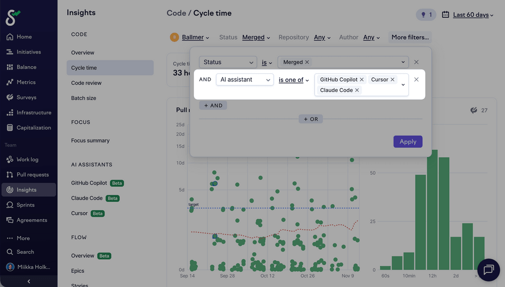 A pull request is considered AI-assisted if any of its commits were made by an author who used an AI tool within the previous 24 hours. You can see which AI tools assisted in an individual pull request by opening it anywhere in the app. To see the effect on metrics, you can filter pull requests in cycle time and batch size insights based on the AI tools involved.