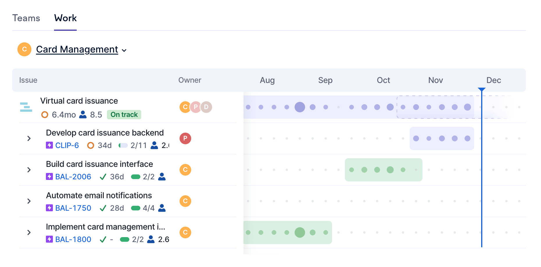 From the team breakdown, you can filter the work timeline to focus on a single team’s issues, or switch to the work tab to see the timeline across all teams.