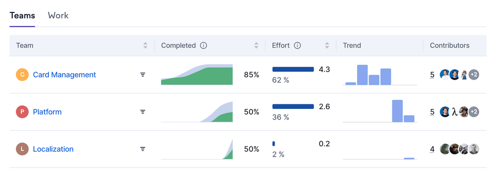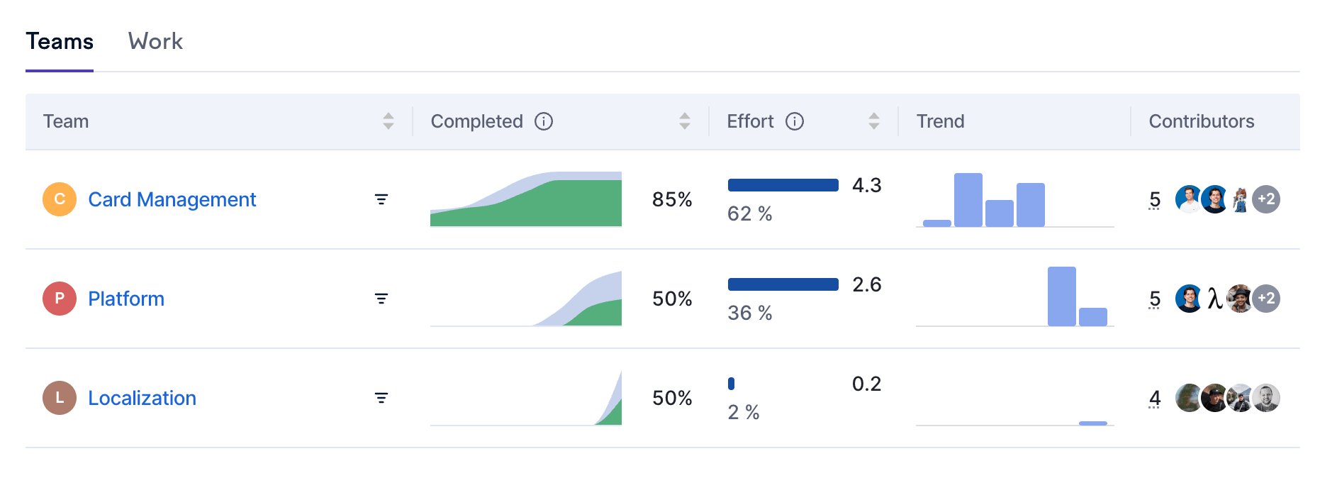 This makes it easier to spot patterns and understand how work for an initiative is distributed across your organization. For example, you might notice that one team has moved on while another is still actively contributing, or that a team has added significant new scope that wasn’t originally planned.