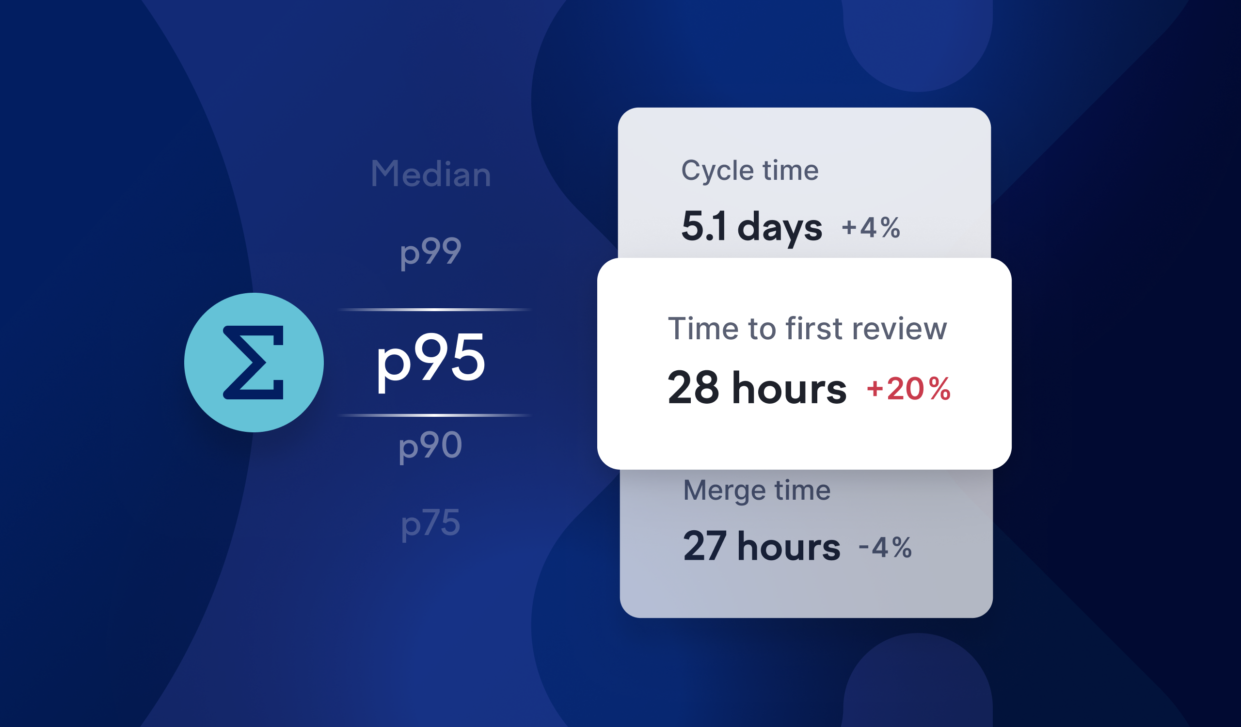 Averages can hide important patterns in your data and are easily skewed by outliers. Percentiles give you a clearer picture of what’s typical and help you spot edge cases. For example, use median to understand typical cycle time, p90 to see how fast most pull requests get their first review, or p99 to detect merge time outliers.