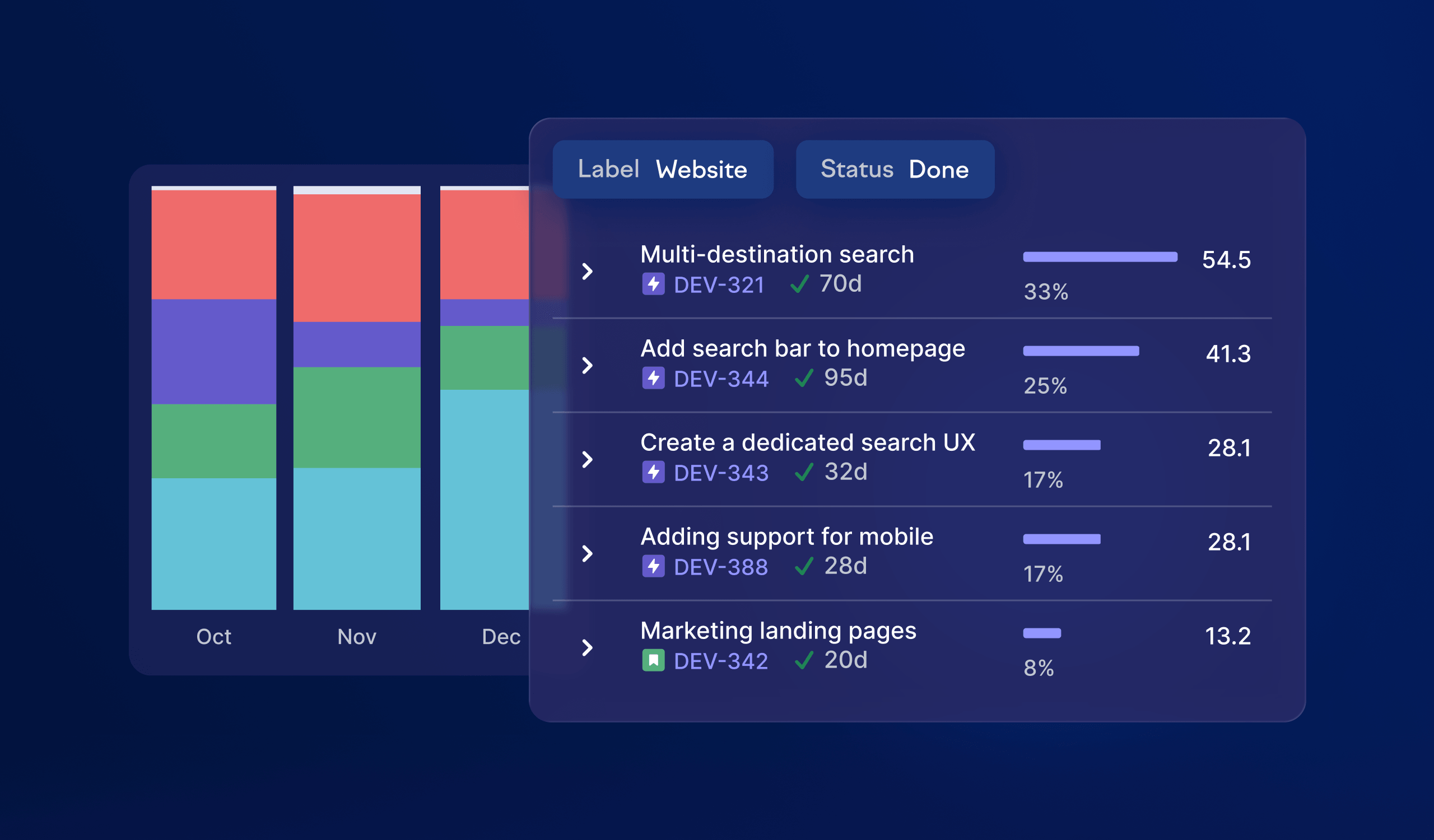 Filter to narrow things down. Filter by issue type, label, or author to focus on the work that’s relevant to your question without leaving investment balance.