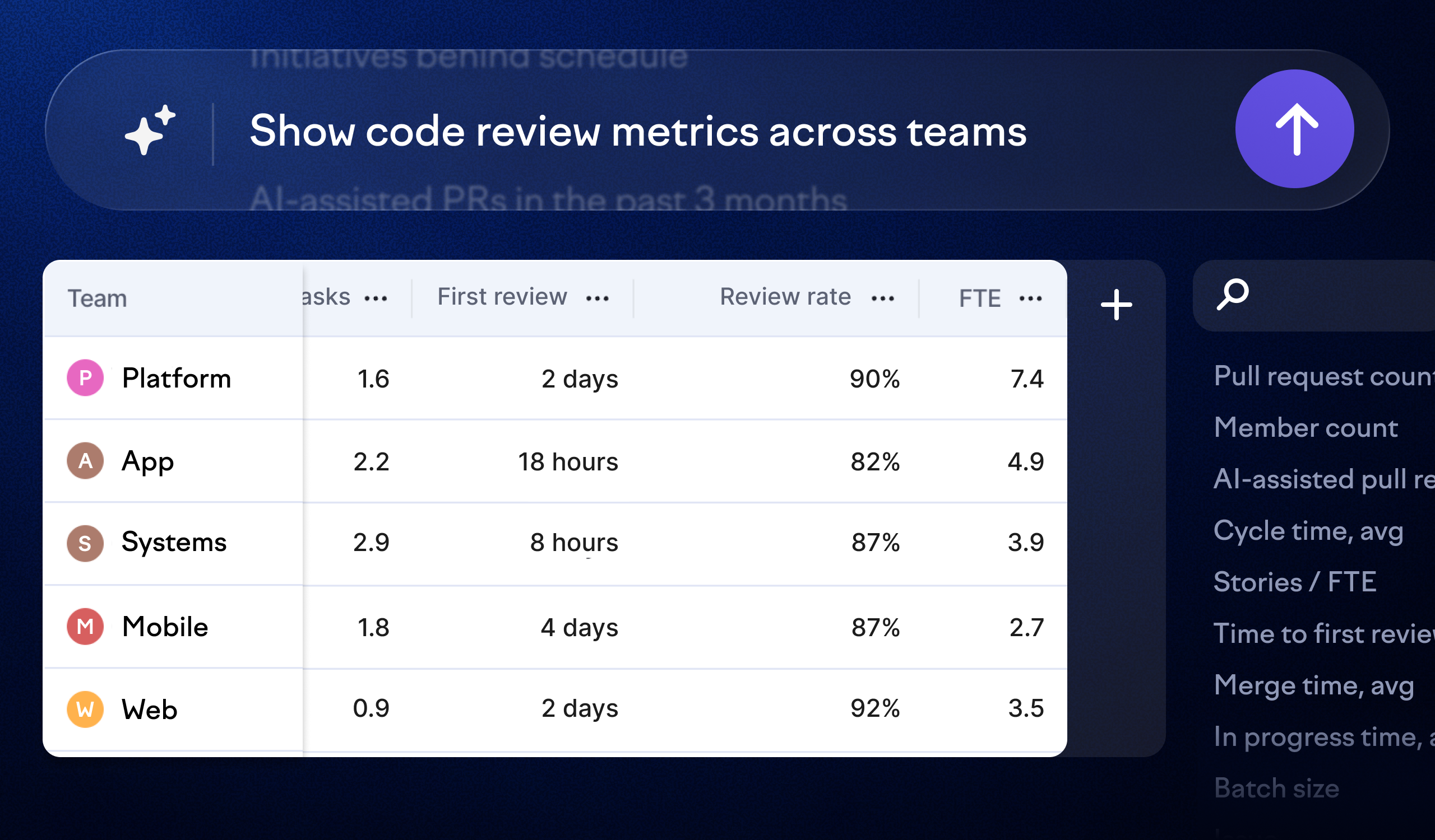 Swarmia gives you strong defaults out of the box, but your team’s questions don’t always fit neatly into a pre-made view. The new explore view lets you build, customize, and save reports that show the exact data you need, whether it’s a combination of metrics, a simplified version of a report, or a drill-down into a specific problem area.